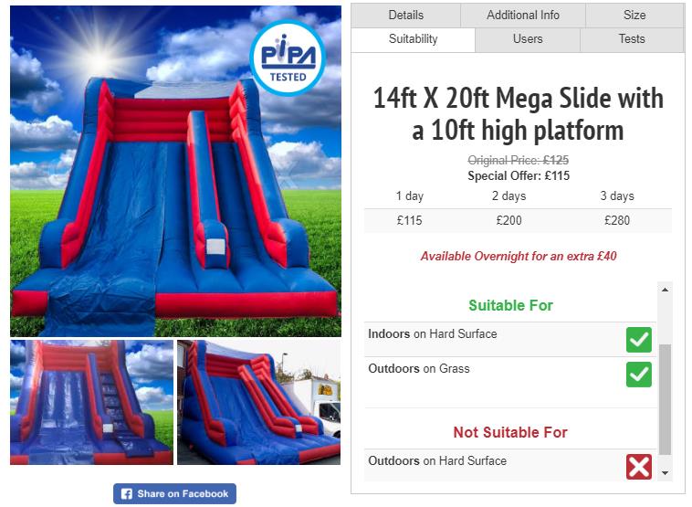 Please note that bouncy castles and slides cannot be set up on outdoor hard surfaces and alike. Surface suitability is located within the product / package, please see image below for reference.