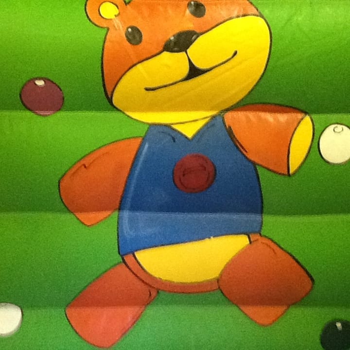The Little Teddy Bear bouncer lovely for little and small places. For yes inside only. The castle has 2 mesh windows at the side. It is plain on the outside and has a teddy bear on the inside.