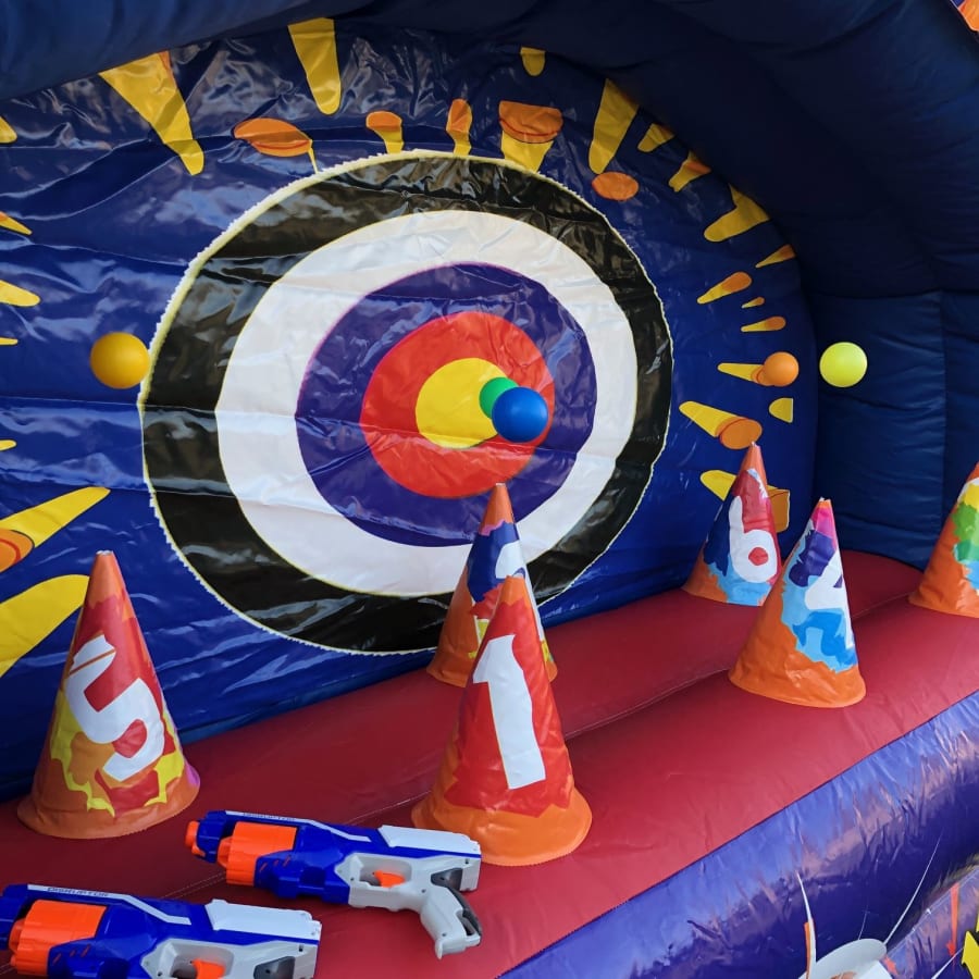 Calling all shooting fans. Check out this new Inflatable by Rockin Ronnies. The target is over 10ft wide with balls that float on air for target practice. The balls bounce up and down on a blanket of air. This make for a tricky target to shoot. Hours of fun for the kids.