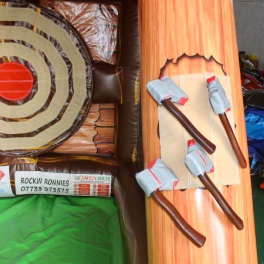 Throw game is inflatable and completely safe, no sharp edges here! The axes are made of foam and have velcro edges that stick to the bullseye target.