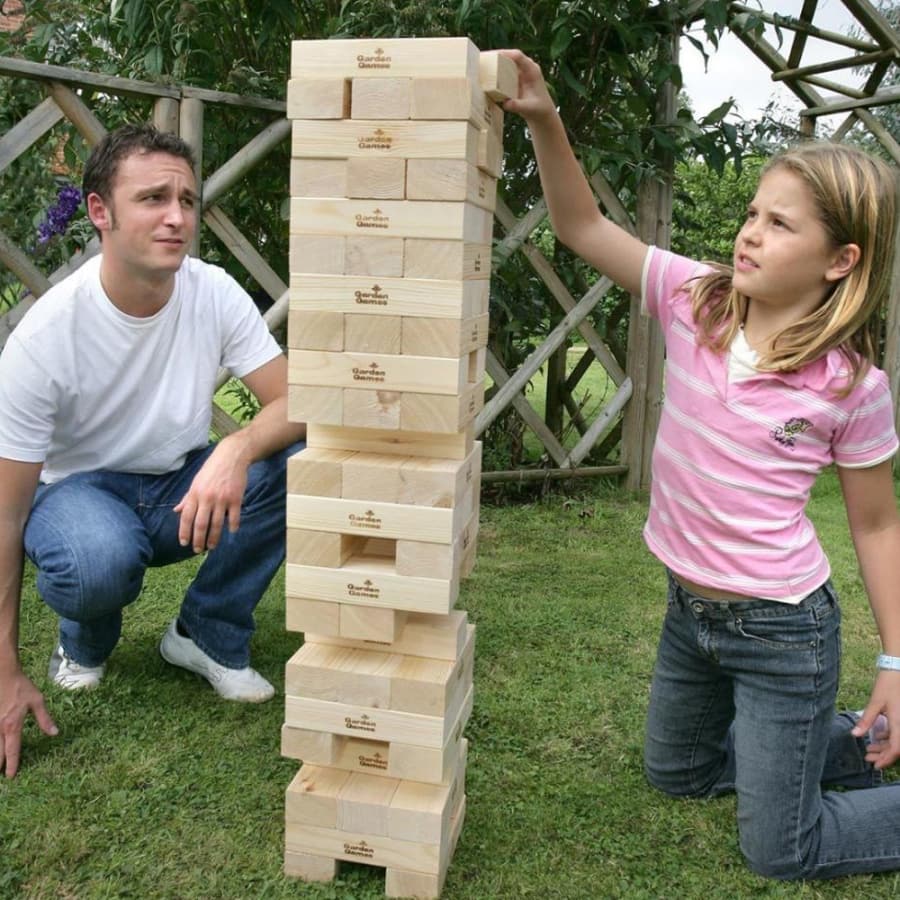Still top of the charts in the Giant Games compendium, starts off at around 3' high, gets to nearly 6' (depending on how good you are) before it all goes wrong and the tower comes tumbling down, losers to rebuild?