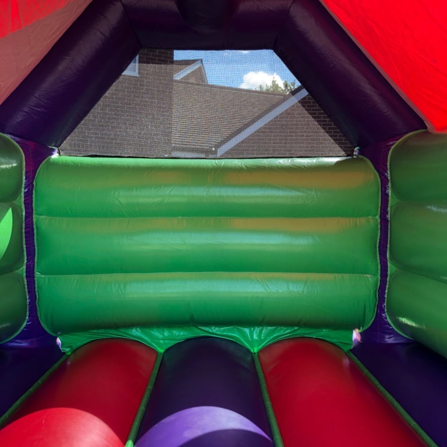 🏰 Looking to add a pop of colour and excitement to your next gathering? Our 10ft x 12ft Purple Bouncy Castle *45* is the perfect choice! This vibrant inflatable play area is a delightful mix of purple, red, and green accents, creating a visually appealing and inviting setup for kids to enjoy.