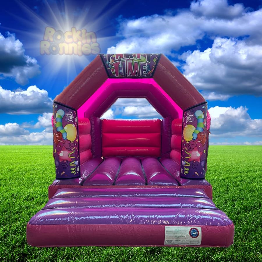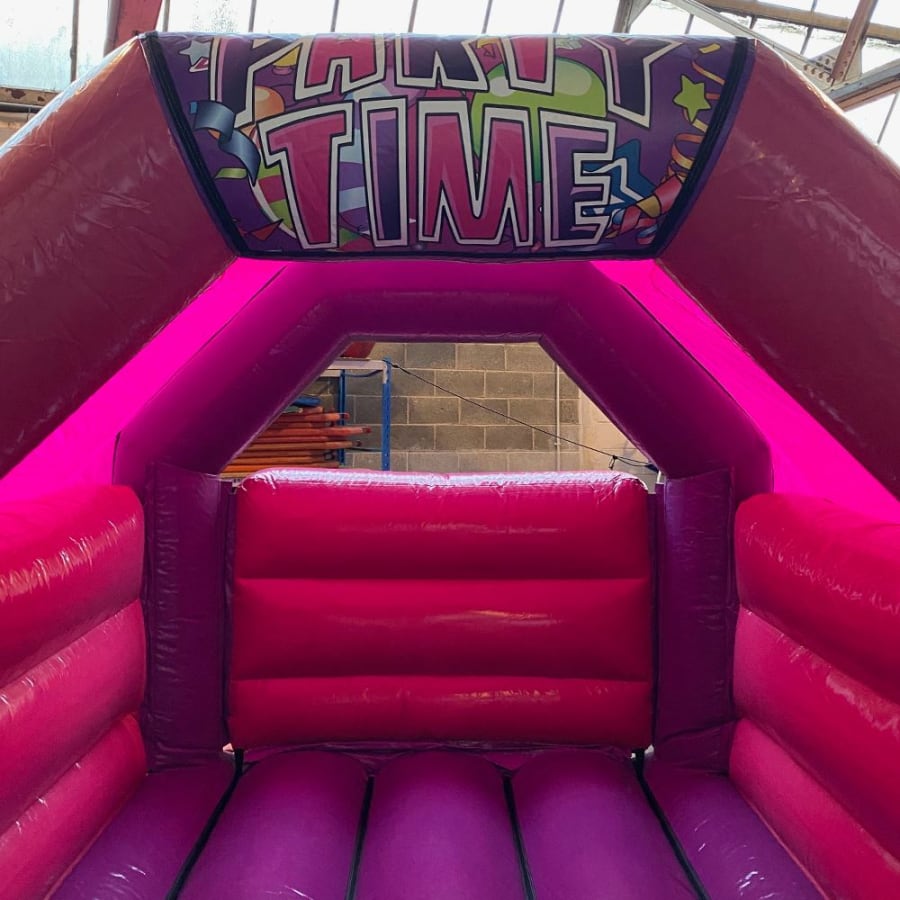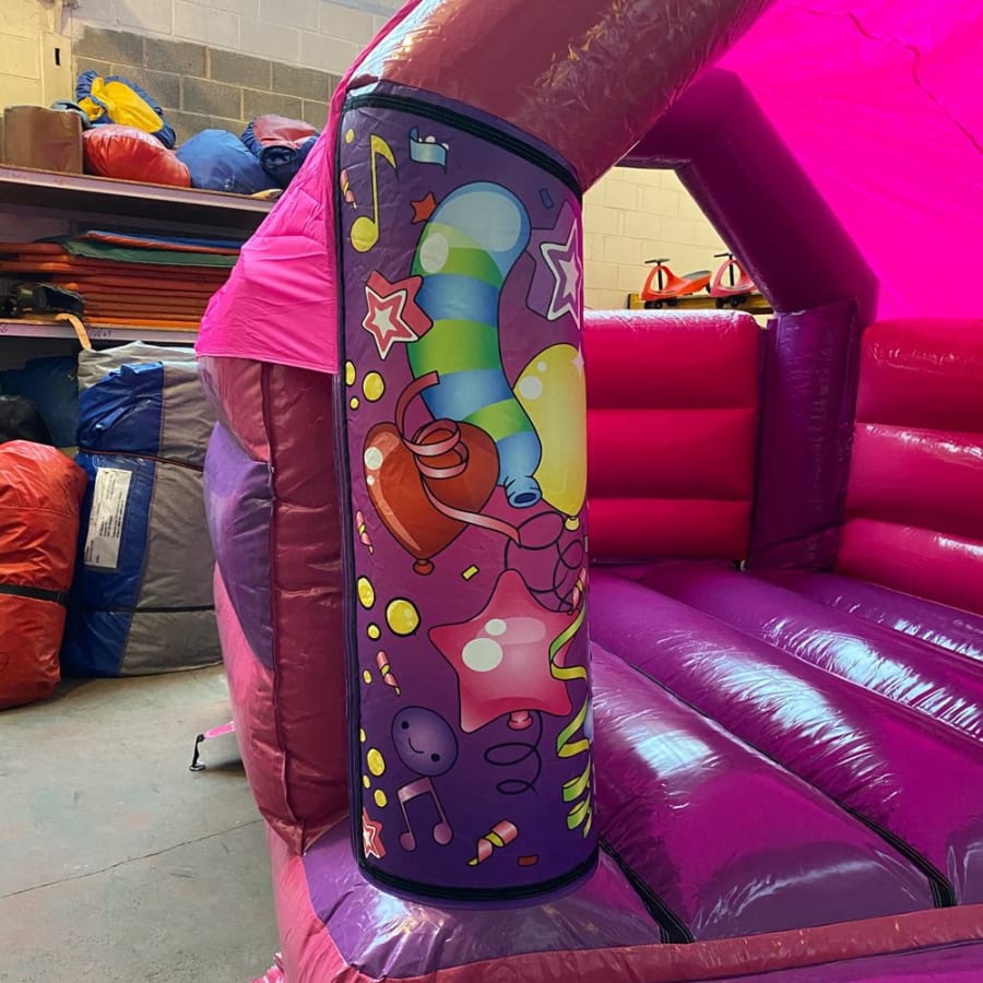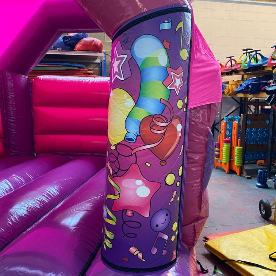 This bright bouncy castle is available in Pink & Purple Party Time.