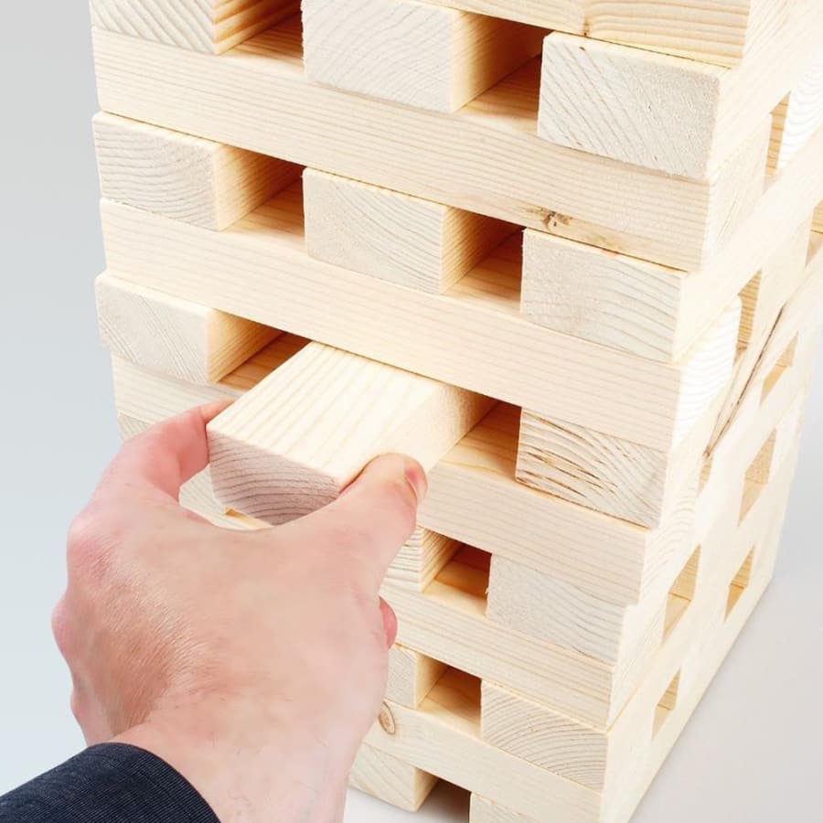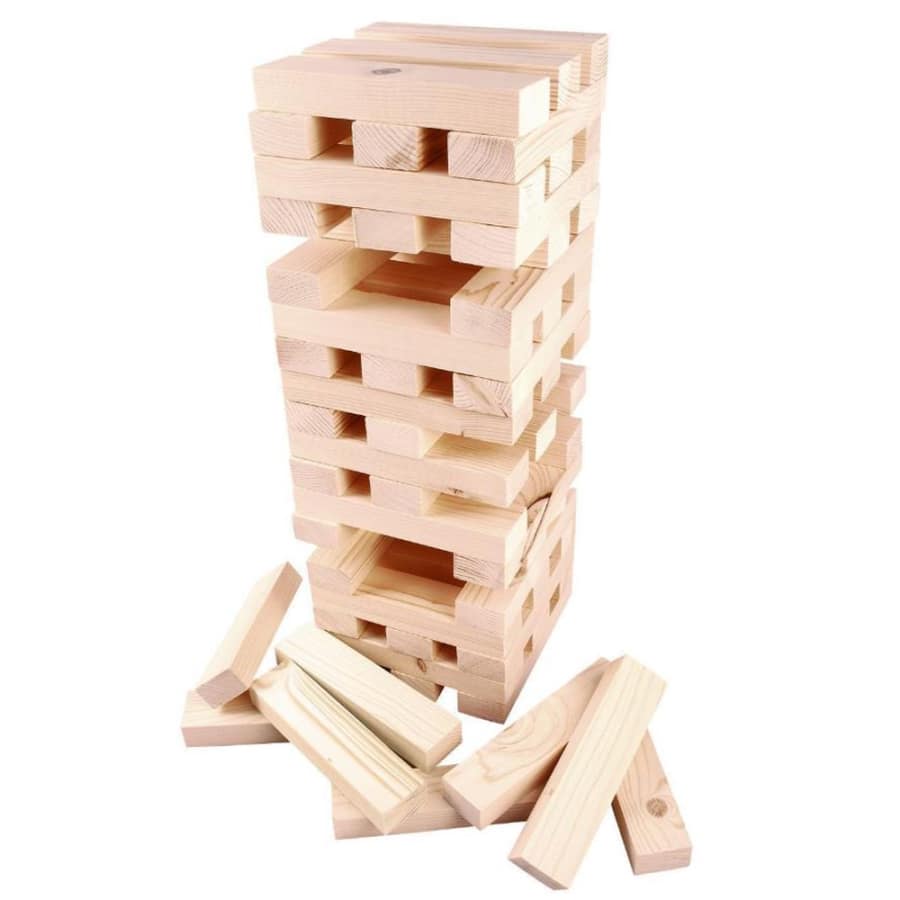 Still top of the charts in the Giant Games compendium, starts off at around 3' high, gets to nearly 6' (depending on how good you are) before it all goes wrong and the tower comes tumbling down, losers to rebuild?