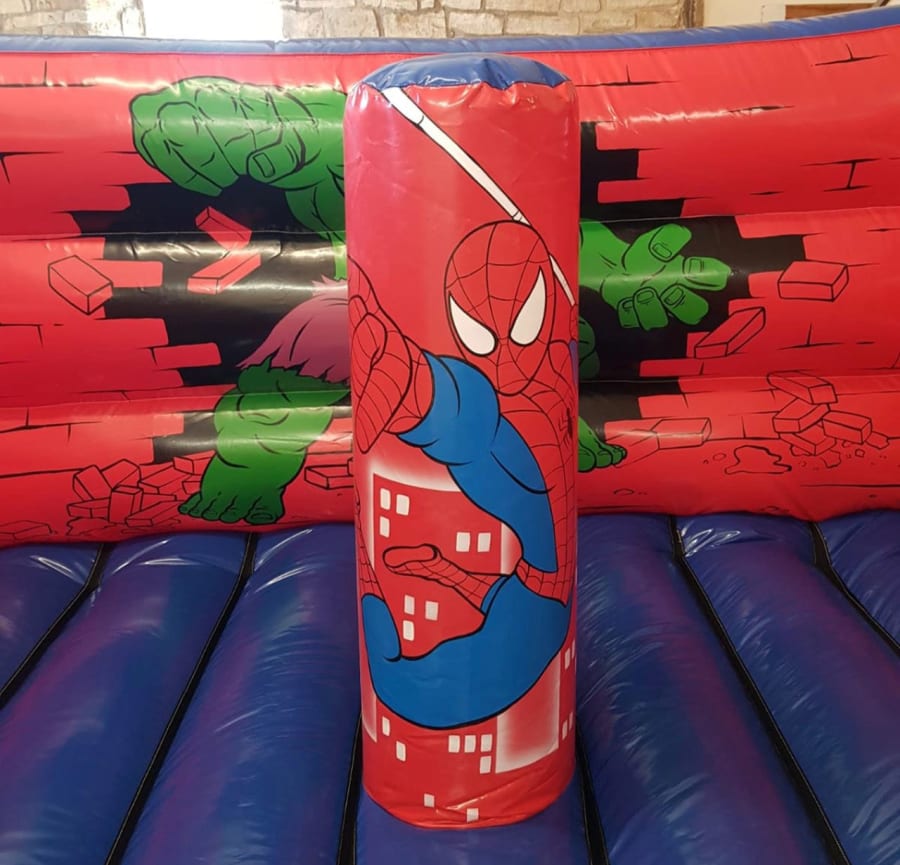 Deluxe low height bouncy castle ideal for indoor hall hire at only 7ft high. Cool design with several Hero's on the side. Also has a bish bash on the inside.