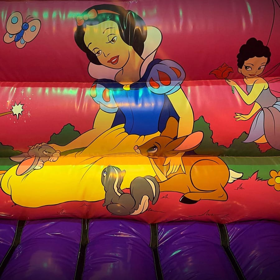 Deluxe Princess themed low height bouncy castle ideal for indoor hall hire at only 7ft high. Cool design with several Superheros on the side. Also has a bish bash on the inside.