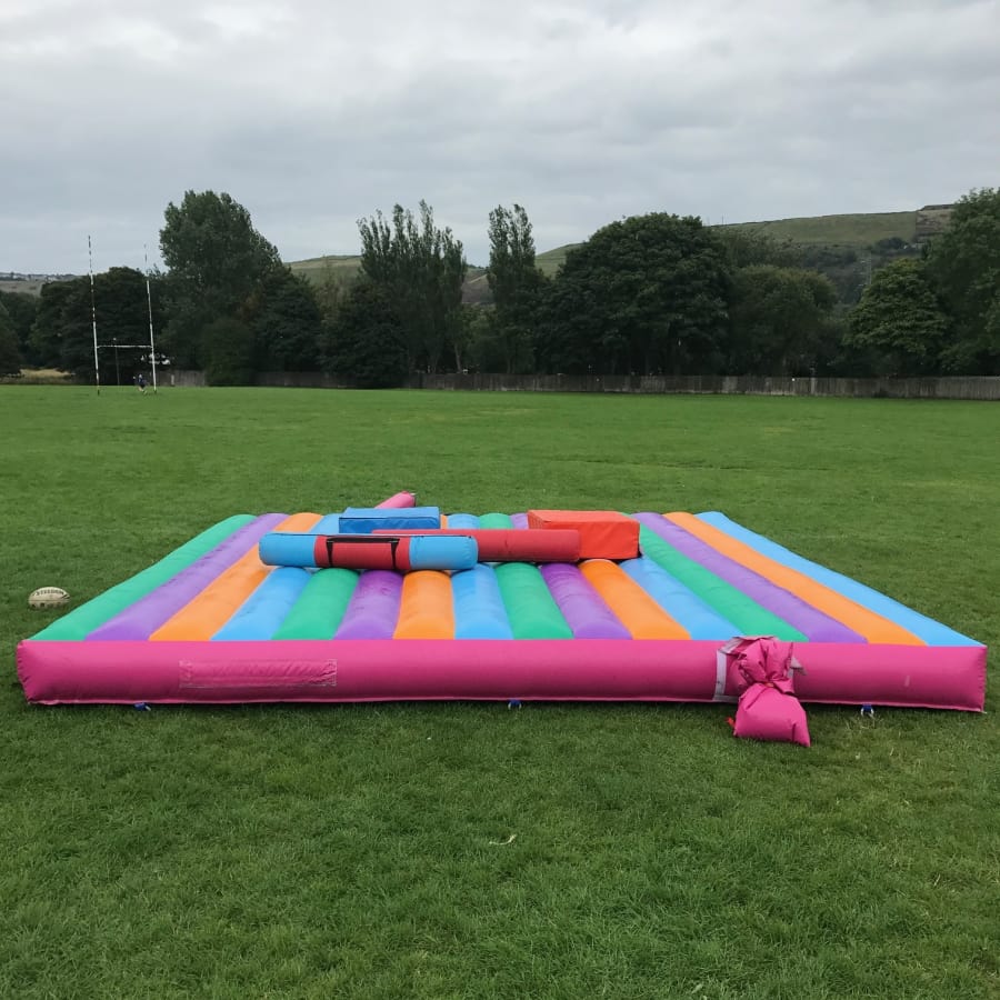 See how long you can last on the gladiator duel. knock your opponent off their podium with your pugil stick ( large padded sticks) the hire includes inflatable bed, two podium tops, two pugil sticks and two helmets great fun