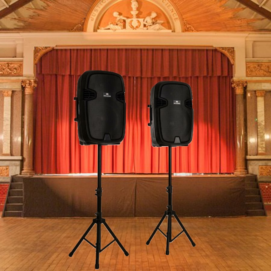 Available to hire as a quality speaker add on. 2 Bluetooth speakers with stands and a microphone. These speakers are great quality with a good bass and sound. You can connect your phone to them and play music.